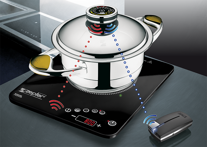 The Zepter Radio Induction Cooker features a new technology, which allows it to communicate with the Zepter Radio Digital Thermocontrol and Zepter Buzzer, and to keep the cooking process under control. At the touch of a button, the Zepter Radio Induction Cooker instantly adjusts and maintains the cooking temperature and automatically stops the cooking process when needed, in accordance with the parameters set on Zepter Radio Digital Thermocontrol.