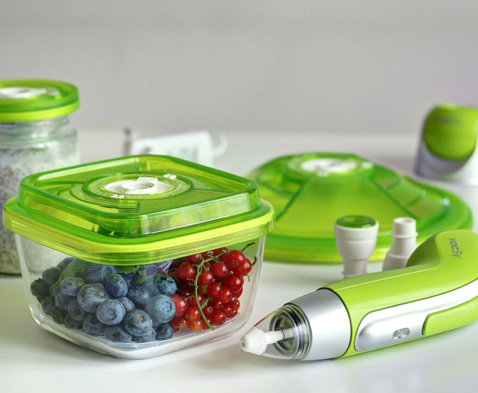 VacSy® is a worldwide-patented food vacuum system - designed to create a vacuum inside special glass containers and special air-tight bags. The vacuum environment deprives bacteria, moulds and fungi of the oxygen needed for survival and maintains the flavour and nutritional properties of the food in an unaltered state! Food stays fresh and healthy for up to 5 times longer than in the normal refrigerator conditions.