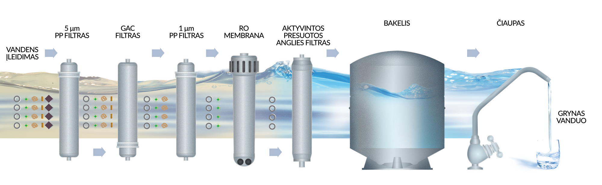 filtruoja bakterijas, virusus, sunkiuosius metalus (šviną, kadmį, gyvsidabrį ir kt.), pesticidų likučius ir nitratų junginius."