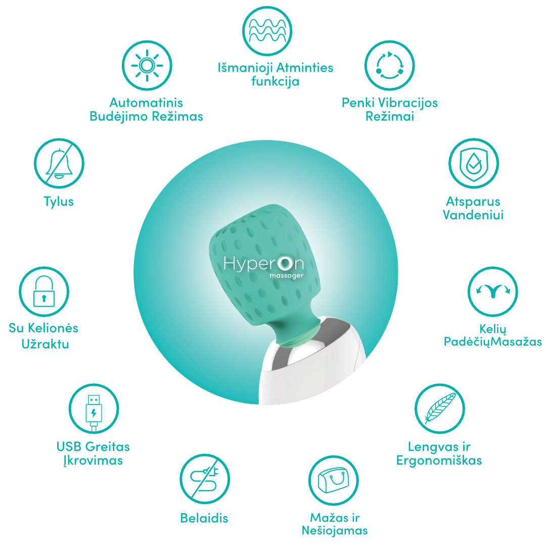Veikdamas remiantis medicininio masažo principais, „HyperOn“ masažuoklis suteikia atpalaiduojantį masažą, malšindamas įtemptų raumenų maudimą bei skausmą.